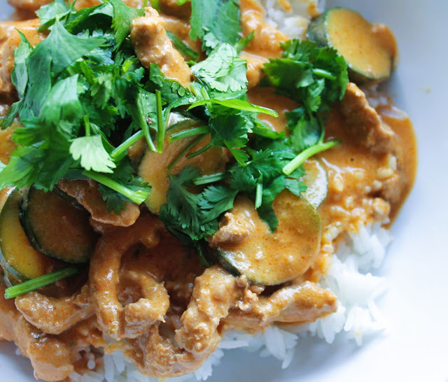 1. Heat the oil in a large saucepan or flameproof casserole. Add the spring onions and coriander (cilantro) stalks and cook for 1 min. Add the pork slices and cook for 5 mins until starting to brown. Stir in the curry paste and peanut butter. (For curry paste- start with 2 tablespoons. Can add more later, in step 2.) After 30 secs, add the sugar, soy and coconut milk, plus ½ can of water (I used less water than that, but ended up adding more later. Use it if you want to). Mix well, put a lid on and leave to simmer for 15 mins over medium-low heat, stirring occasionally.